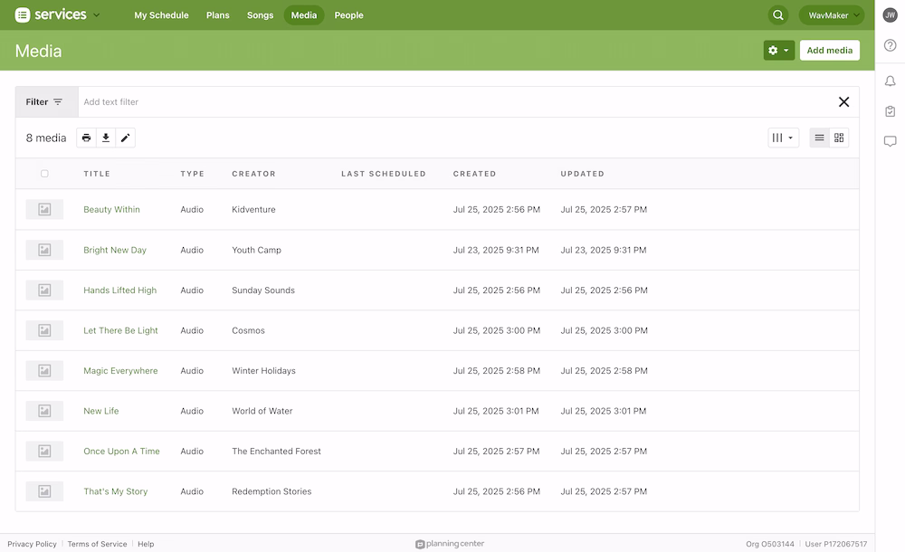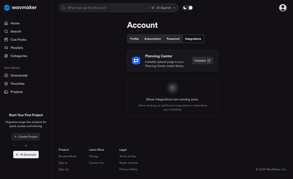 Our Planning Center integration enables you to import songs directly from WavMaker to your Planning Center Services account. Please note that you'll need an active WavMaker subscription to take advantage of this integration.